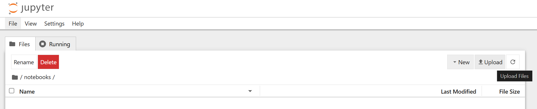 У середовищі Jupyter Notebook, відкривши файловий браузер, перейдіть у створений вами каталог notebooks. У правому верхньому куті натисніть кнопку "Завантажити" (Upload) й імпортуйте CSV-файл. Найзручніше буде, якщо файл знаходиться в тому ж каталозі, що й блокнот, який ви створите для конвертації дат.
