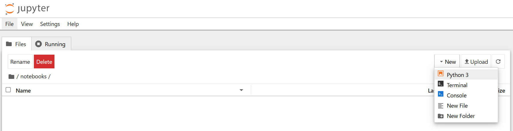У папці notebooks створіть новий блокнот для роботи з датами у вашому дослідницькому проєкті. Для цього натисніть кнопку "Новий" (New) у верхньому правому куті інтерфейсу файлового менеджера Jupyter Notebook. Якщо ви щойно встановили Anaconda (як описано вище), єдиний доступний варіант — це створення блокнота Jupyter з використанням ядра Python 3 (бекенд-компонента, що виконує код у блокноті). У подальшому ми розглянемо, як додати ядра для інших мов програмування.