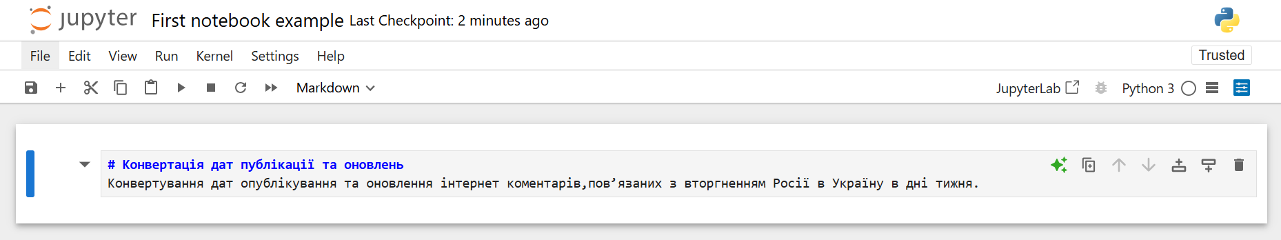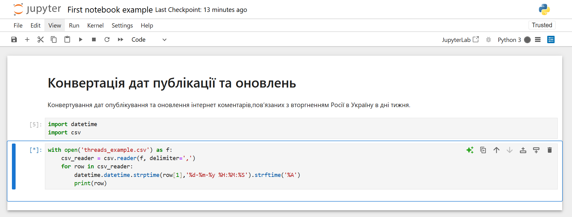 Дати публікації та оновлення генеруються автоматично під час додавання або редагування історії, тому вони є узгодженими. Завдяки цьому їх можна конвертувати у дні тижня за допомогою Python. Якщо у вас немає значного досвіду роботи з конвертації дат у Python, Jupyter Notebook стане зручним інструментом для експериментів з різними модулями і методами.