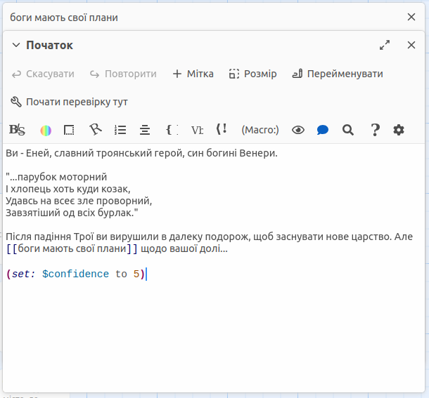 Таким чином ви використали макрос "set", щоб створити змінну під назвою "впевненість" (confidence). Варто додавати змінні на першому параграфі, щоб ви могли їх далі відстежувати. Гравець же не зможе їх побачити. Більшість макросів є в дужках та містять двокрапку після назви макросу.