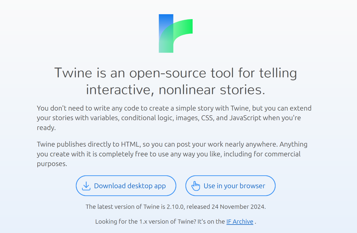 Щоб пройти цей урок, вам знадобиться комп’ютер із підключенням до Інтернету для доступу до Twine. Twine можна завантажити та запустити на робочому столі, але його також можна запустити безпосередньо в браузері. Тут використано Twine версії 2.10.0 (поточна версія Twine доступна у браузері станом на 24 листопада 2024 року). В уроці, як приклад, показано інструкції для використання Twine саме в браузері. Перевагою використання Twine безпосередньо в браузері є доступність. Недоліком є те, що вам потрібно буде завантажувати та зберігати гру на робочому столі, а потім знову завантажувати її у браузер кожного разу, коли ви починаєте новий робочий сеанс. Адже браузерна версія Twine зберігає вашу гру лише в кеші браузера. Більш детально кроки для збереження вашої гри розглянуті в розділі "Збереження вашої гри".