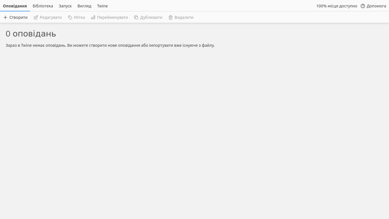 Якщо ви вперше використовуєте Twine, з’явиться базовий вступ, де буде запропоновано ознайомитися з Посібником Twine. Також буде інформація, що Twine зберігає вашу роботу лише в браузері, тому не забудьте використовувати функцію "Архів", яка міститься у розділі "Бібліотека" аби зберегти резервну копію створених даних. Якщо ви прочитали або пропустили цей вступ, Twine перемістить вас до списку ваших оповідань. Спочатку це поле буде порожнім. Воно буде заповнюватися, коли ви створите кілька власних оповідань. Щоб створити своє перше оповідання, натисніть "+ Створити".