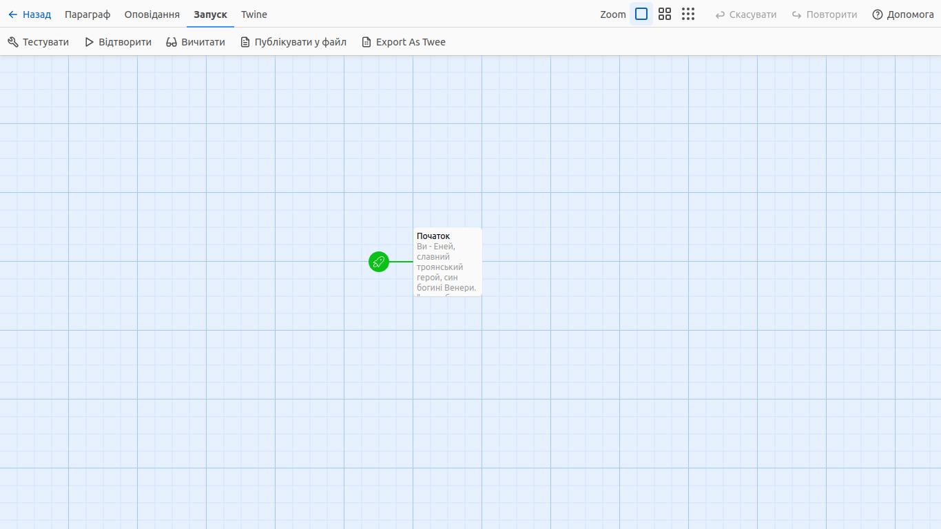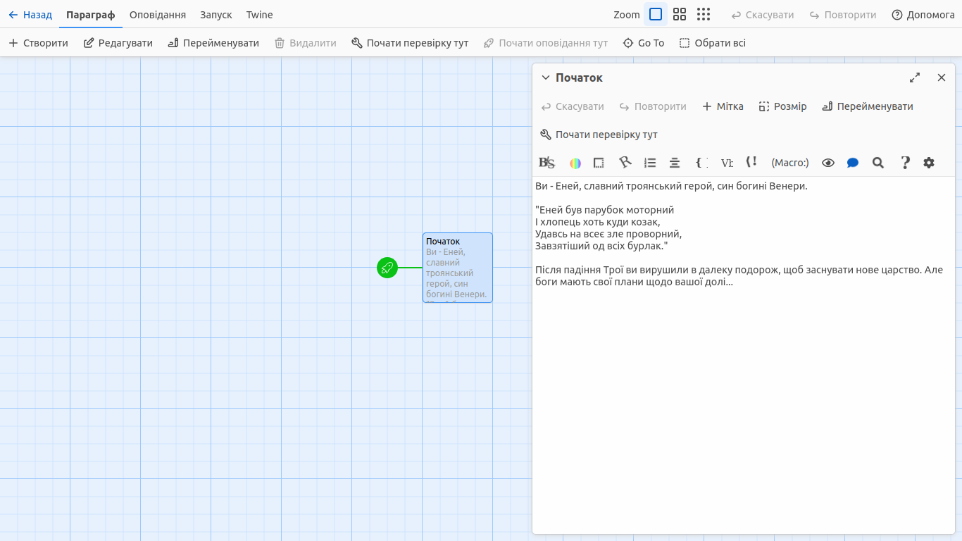 Потім вам буде запропоновано додати назву вашого оповідання. Як вже згадувалося, можна спробувати потренуватися на сюжеті поеми Івана Котляревського, "Енеїді", та додати відповідну назву "Енеїда.Twine". Коли ви введете назву свого оповідання, натисніть "Створити". Потім Twine переведе вас на карту оповідання. Ця сітка — це погляд розробника або творця вашого оповідання. Тут ви можете додавати та редагувати створене оповідання.