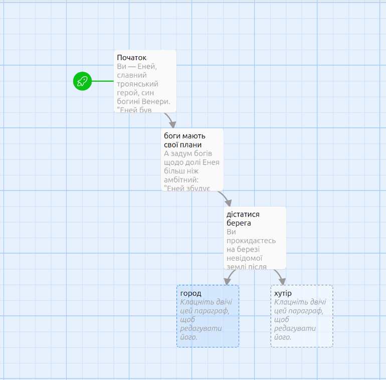 Цей параграф представить гравцеві два посилання: "город" і "хутір". Коли ви створюєте ці посилання, Twine автоматично створить два нових параграфи. У результаті вийде розгалужена розповідь. Перший малюнок нижче показує вигляд цього наративу зі сторони розробника, другий показує, як гра виглядатиме для гравця: